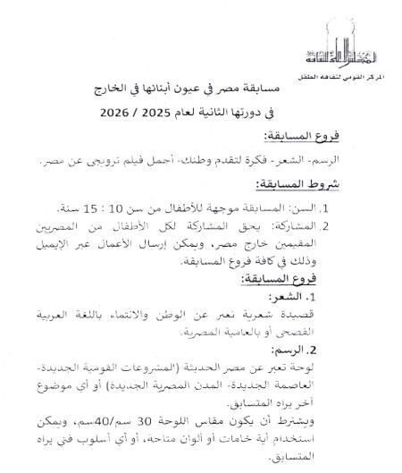 تهدي سفارة جمهورية مصر العربية في براتيسلافا أطيب تحياتها وتتشرف بالإفادة بمد موعد المشاركة في مسابقة "مصر في عيون أطفالها بالخارج" حتى يوم 30 أبريل 2026 و أستقبال الأعمال على موقع المركز القومي لثقافة الطفل infoenccc@gmail.com