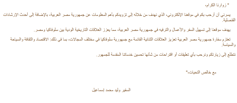 تهدي سفارة جمهورية مصر العربية في براتيسلافا أطيب تحياتها وتتشرف بالإفادة بتخصيص بريد إلكتروني ورقم للتواصل كما يلي