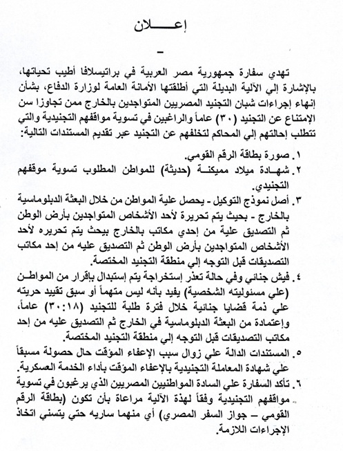 تهدي سفارة جمهورية مصر العربية أطيب تحياتها وتتشرف بالإفادة بوجود تعليمات جديدة صادرة عن الأمانة العامة لوزارة الدفاع فيما يتصل بتجديد جوازات السفر للمواطنين المصريين المقيمين بالخارج كما يلي