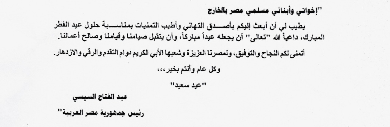 تهدي سفارة جمهورية مصر العربية في براتيسلافا أطيب تحياتها لمسلمي الجالية المصرية في سلوفاكيا وتتشرف بنقل رسالة تهنئة رئيس الجمهورية بمناسبة حلول عيد الفطر المبارك، وفيما يلي نص الرسالة: